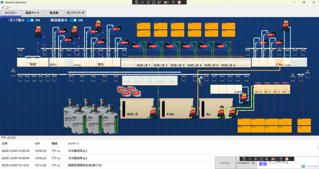 温度、圧力、流量、整流器などのデータをPLCからリアルタイムで取得します。